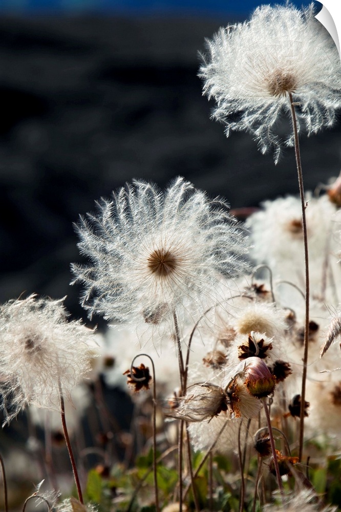 <p>Close up view of mountain avens that have gone to seed on the moraine of Root and Kennecott Glaciers, Wrangell St. Elias National Park & Preserve, Southcentral Alaska, Summer</p>