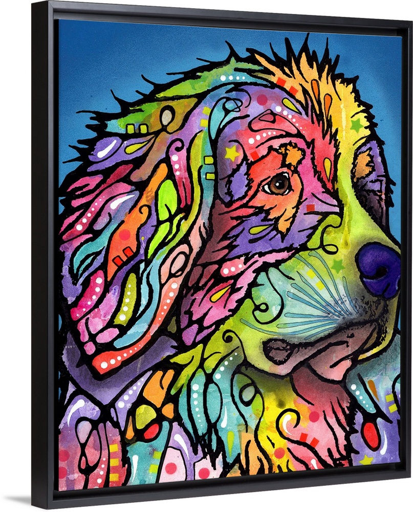 <p>Colorful painting of a Mountain Dog with abstract designs on a blue background.</p>