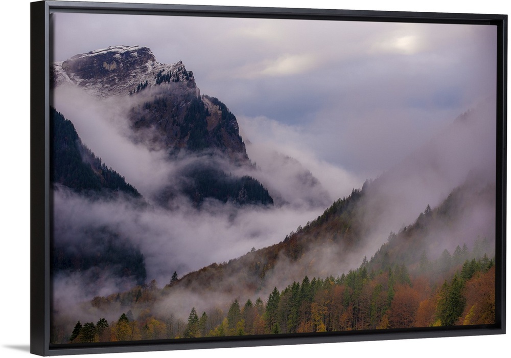 <p>A photograph of a mountain valley covered in deep with thick fog shrouding the area.</p>