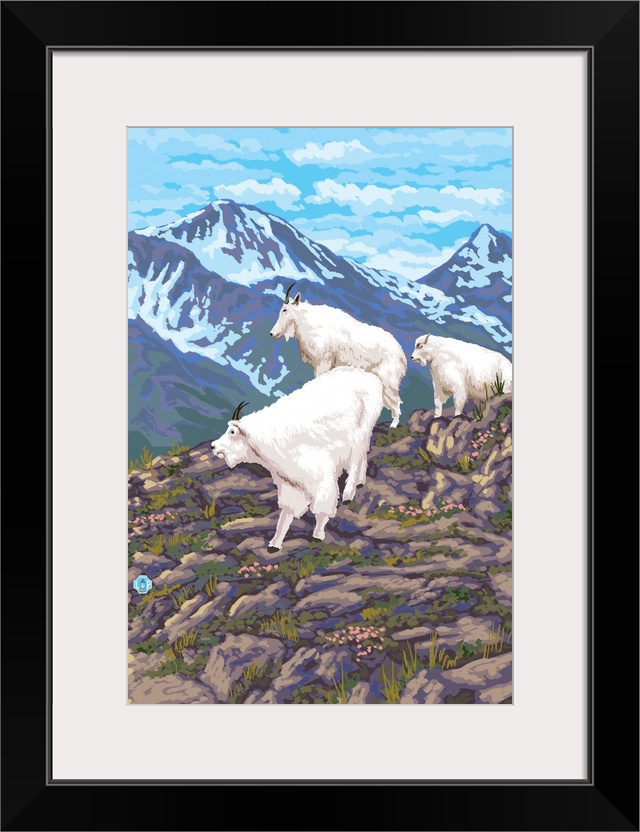 <p>Retro stylized art poster of three mountain goats on rocks, overlooking mountainous valley.</p>