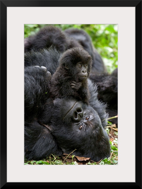 <p>Mountain Gorilla.Gorilla gorilla beringei.1.5 year old baby playing on silverback.Parc National des Volcans, Rwanda.*Endangered species</p>