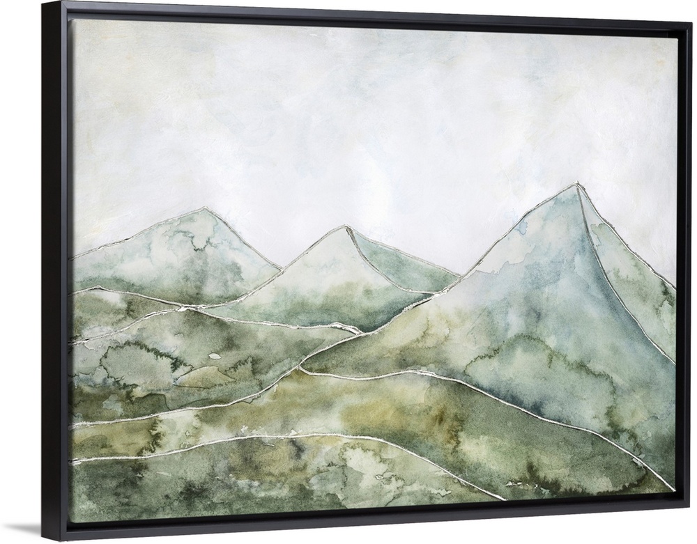 <p>A contemporary stylized watercolor landscape featuring rolling hills in front of tall mountains in cool, calm tones</p>