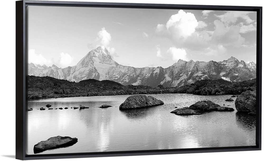 <p>Black and white landscape image of a lake with snow covered mountains in the background.</p>