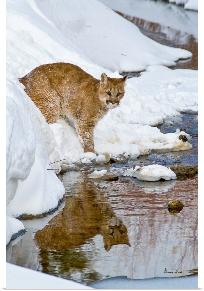 <p>Young Mountain Lion (Felis concolor) cub crossing a stream near Bozeman Montana, USA.</p>