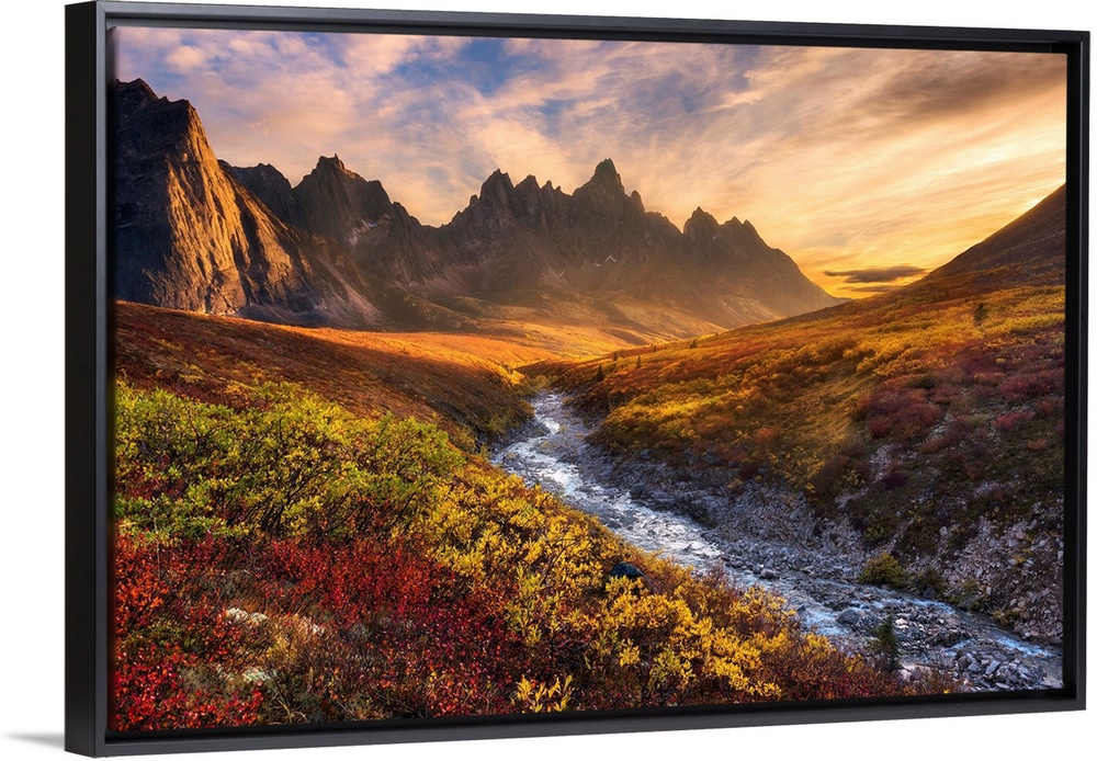 <p>Beautiful sunset light and colorful tundra looking toward tombstone mountain during autumn in the Ogilvie mountain wilderness, Yukon territory.</p>