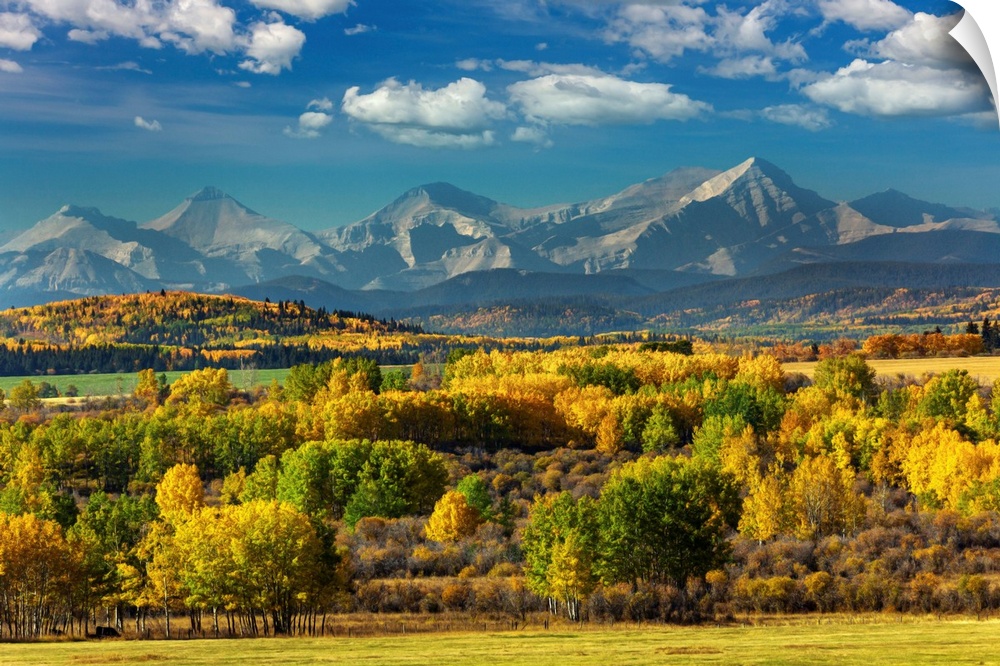 <p>Mountain range with colourful covered treed foothills in the fall with blue sky and clouds, West of Calgary, Alberta, Alberta, Canada</p>