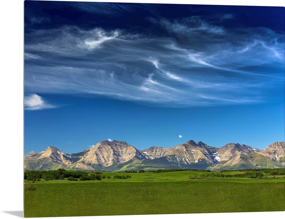 <p>Mountain range with wispy white clouds, blue sky and green field in the foreground</p>