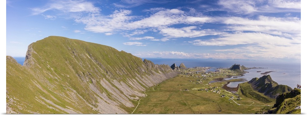 <p>Mountain ridge frames the village of Sorland surrounded by sea, Vaeroy Island, Nordland county, Lofoten archipelago, Norway, Scandinavia, Europe</p>