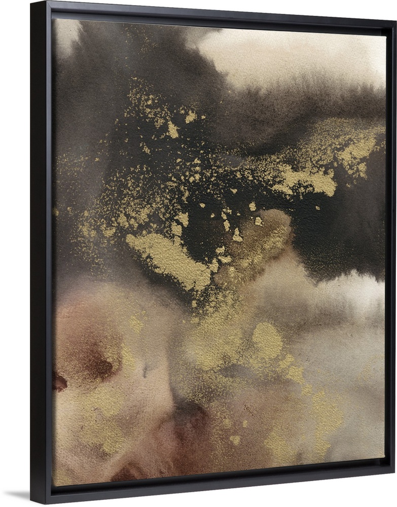 <p>Large abstract painting created with shades of brown and metallic gold accents.</p>