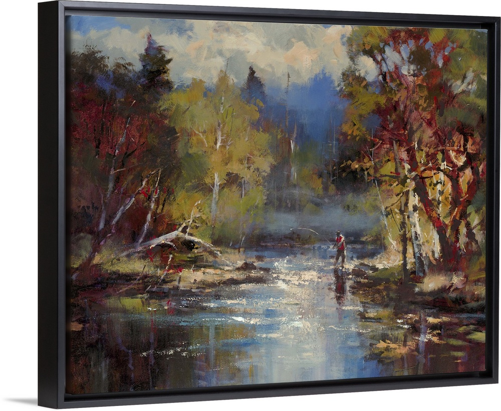 <p>Contemporary painting of a man fishing in a forest stream, with enormous clouds in the background.</p>