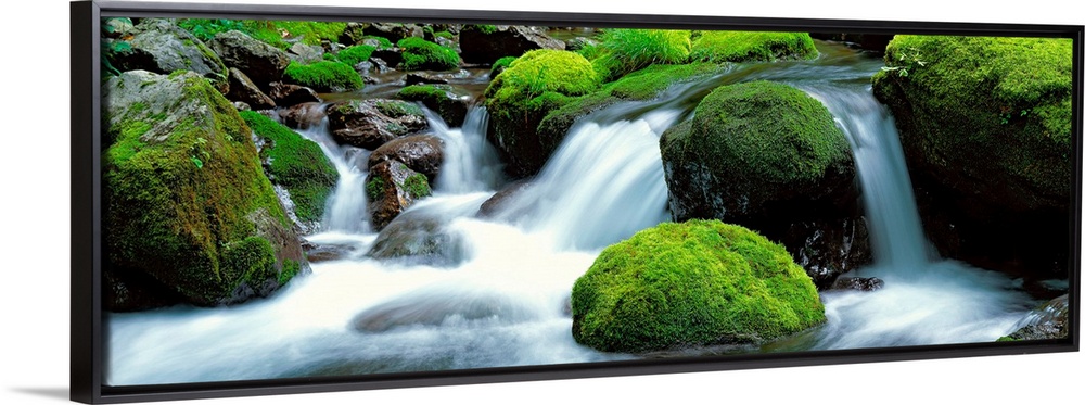 <p>Panoramic photograph showcases water as it rushes down the small drop-offs of a river littered with moss-covered rocks.</p>