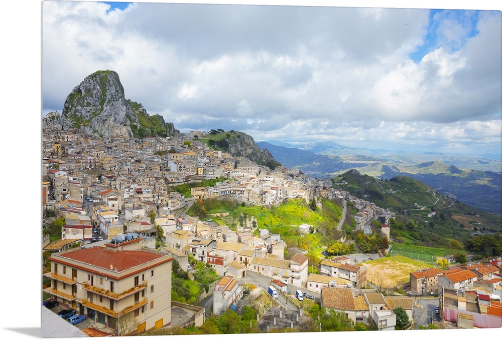 <p>Mountain village of Caltabellotta, high angle view, Caltabellotta, Agrigento district, Sicily, Italy, Mediterranean, Europe</p>