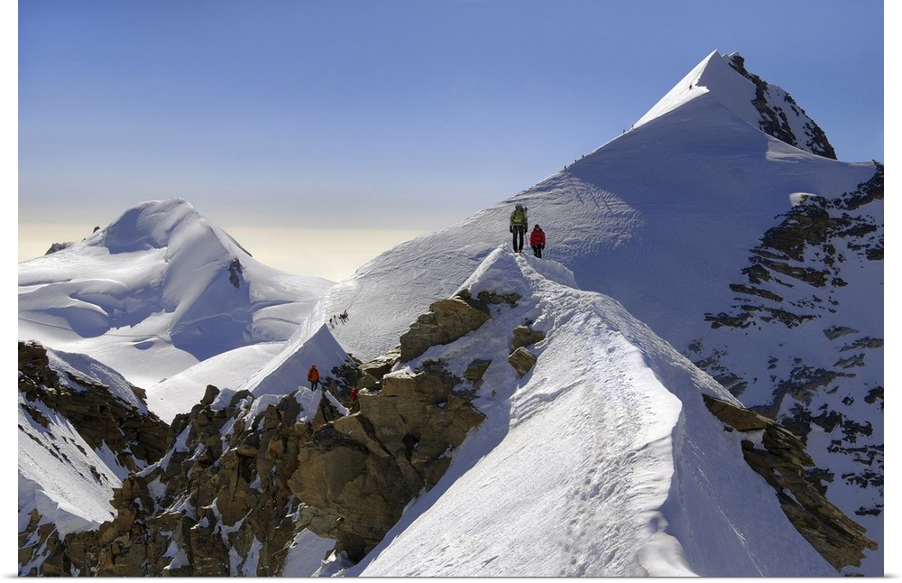<p>Mountaineers climbing sharp ridge of Crossing of Liskamm, (traversata dei Lyskamm) Monte Rosa, Ayas Valley, Aosta Valley, Italy.</p>