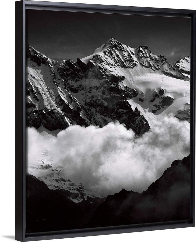 <p>Black and white photograph of mountain peaks surrounded by rolling clouds.</p>