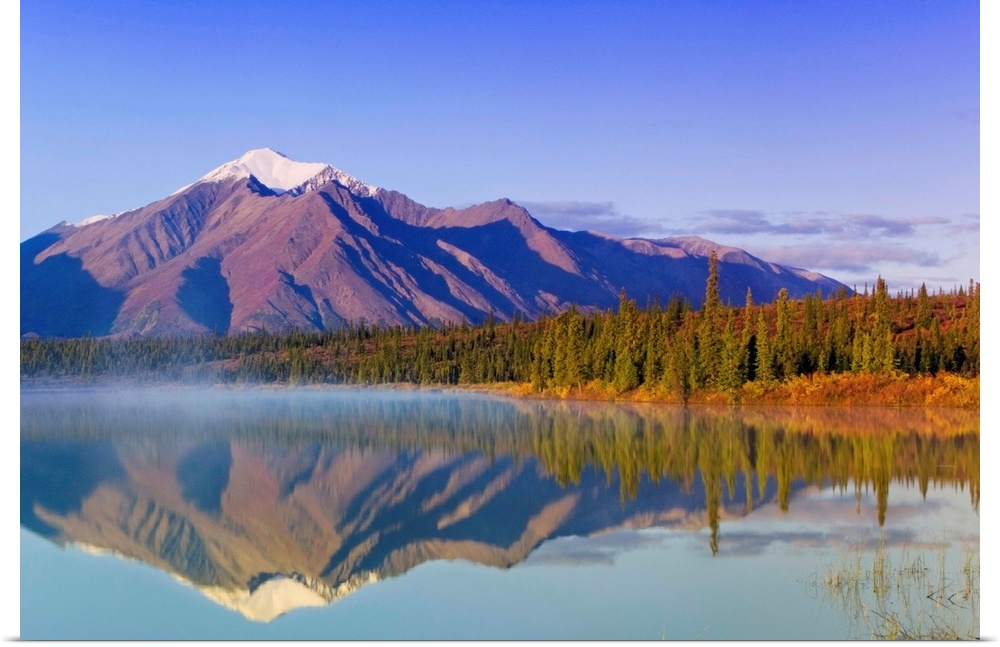 <p>Mountain reflected in Drasher Lake at sunrise, Denali Highway, fall Alaska, USA</p>