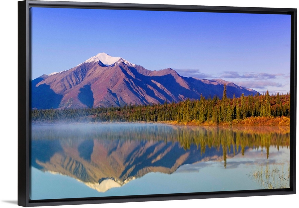 <p>Mountain reflected in Drasher Lake at sunrise, Denali Highway, fall Alaska, USA</p>