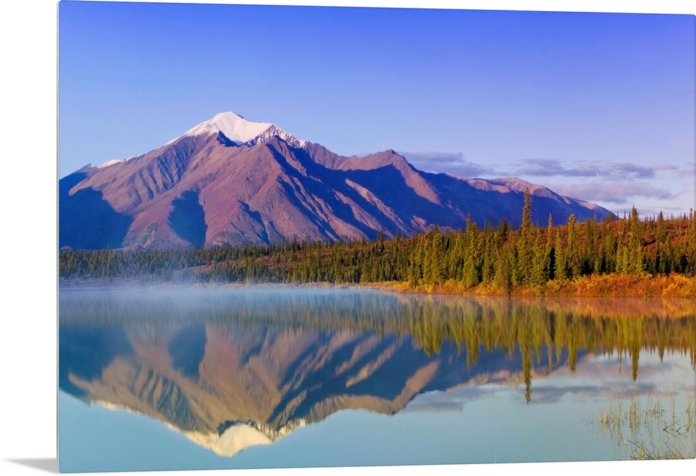 <p>Mountain reflected in Drasher Lake at sunrise, Denali Highway, fall Alaska, USA</p>