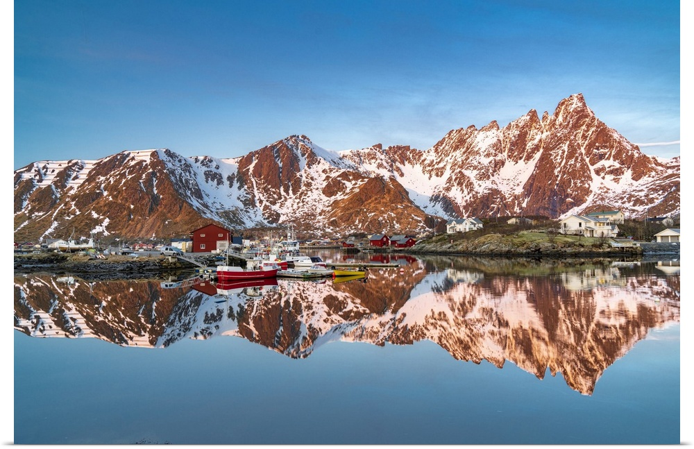 <p>Mountains reflected in the cold sea at sunrise, Ballstad, Vestvagoy, Lofoten Islands, Norway, Scandinavia, Europe</p>