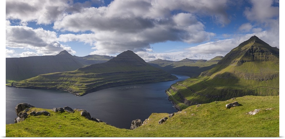 <p>Mountains surrounding Funningsfjordur on the island of Eysturoy, Faroe Islands, Denmark. Summer (June) 2017.</p>