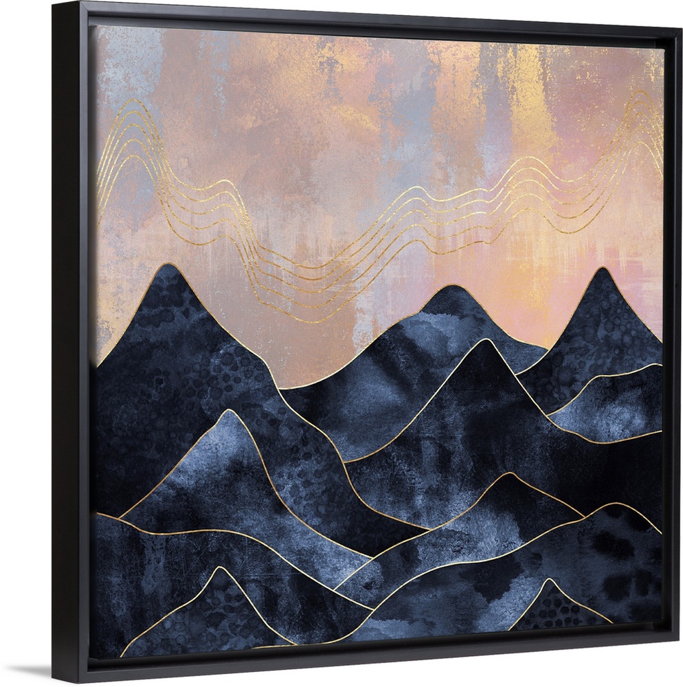 <p>Overlapping, organic trianglular shapes in shades of indigo outlined in gold, representing a series of mountains under a rose gold sky.</p>