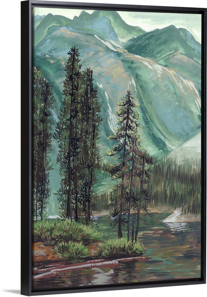<p>Vertical painting of a lush green mountain and wilderness landscape with a river in the foreground.</p>