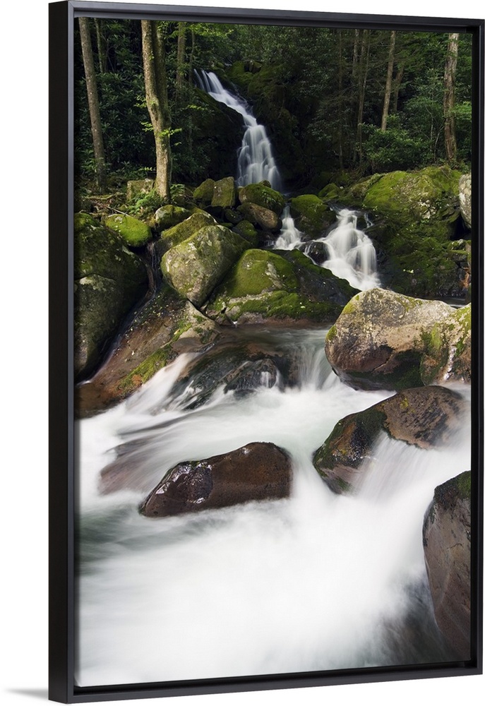 <p>A stream creates waterfalls and rapids through a river bed of moss covered boulders.</p>
