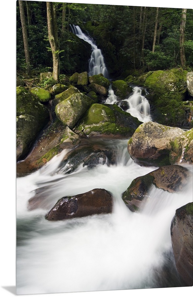 <p>A stream creates waterfalls and rapids through a river bed of moss covered boulders.</p>