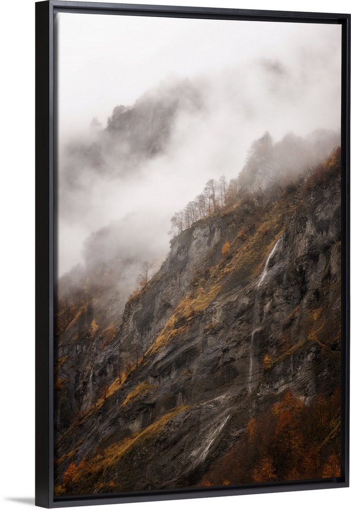 <p>Vertical view of a moutain in Sixt-Fer-a-Cheval area in the French Alps, some fog and a little waterfall in the middle of a foggy scene at fall.</p>