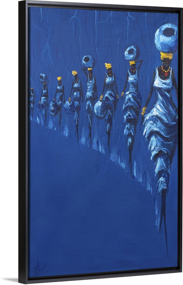 <p>Walking as in a procession, many women travel great distances to fetch water home for their family. This tradition makes them a role model to follow, believes Ghanaian artist Francis Amoah. Painting with acrylics with a predominance of blue hues, Amoah depicts the women wearing golden headdress walking in different postures.</p>