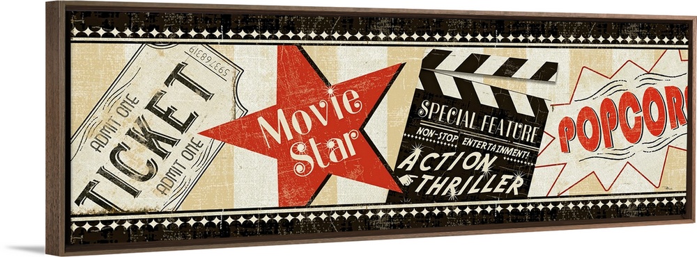 <p>This vintage style artwork has a film strip appearance with an old fashioned ticket, popcorn sign and movie star symbol.</p>