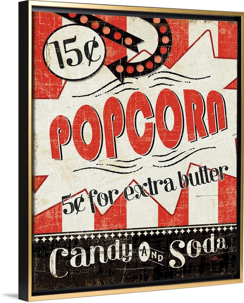 <p>Canvas print of a vintage advertisement for popcorn and candy.</p>
