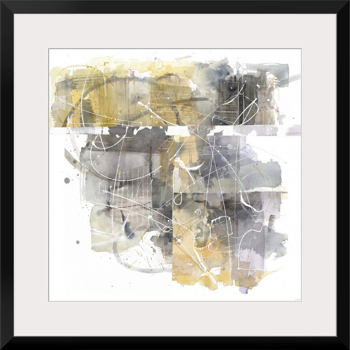 <p>Busy square abstract painting in shades of yellow and grey on a white background.</p>