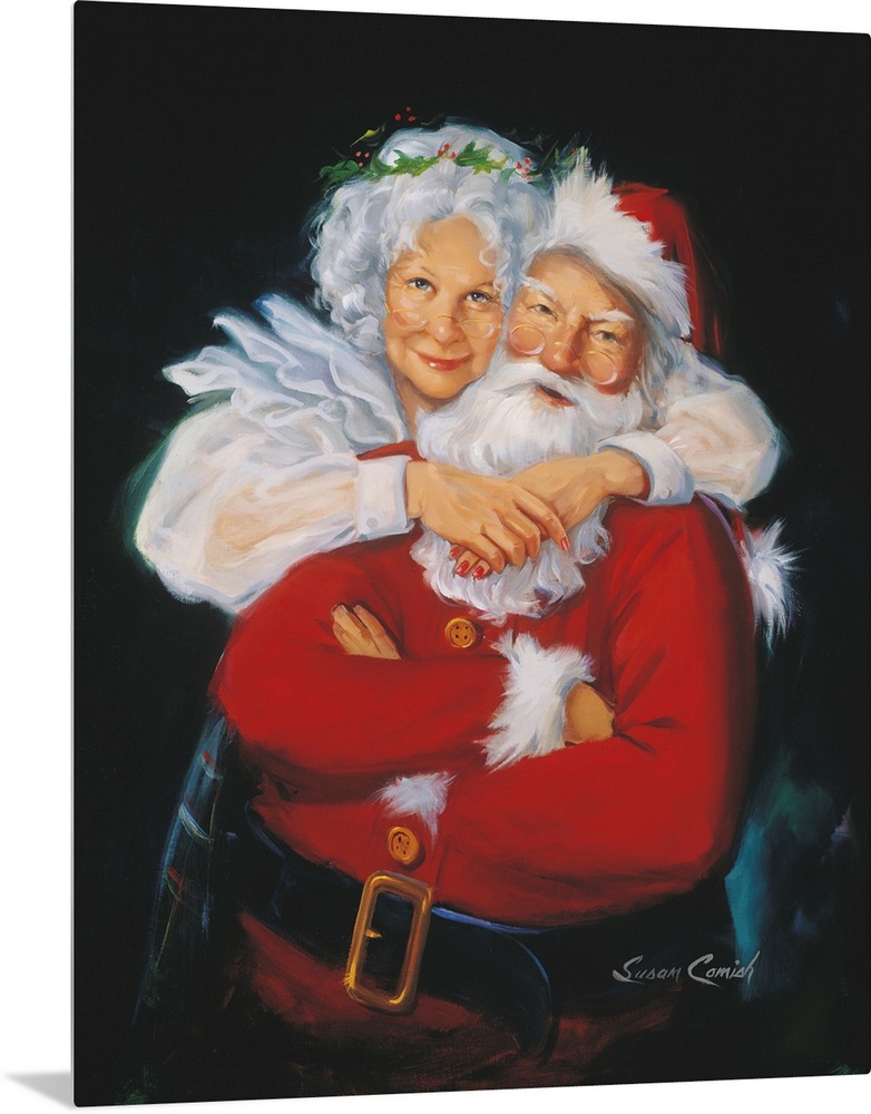 <p>Portrait of Mrs. Claus hugging Santa.</p>