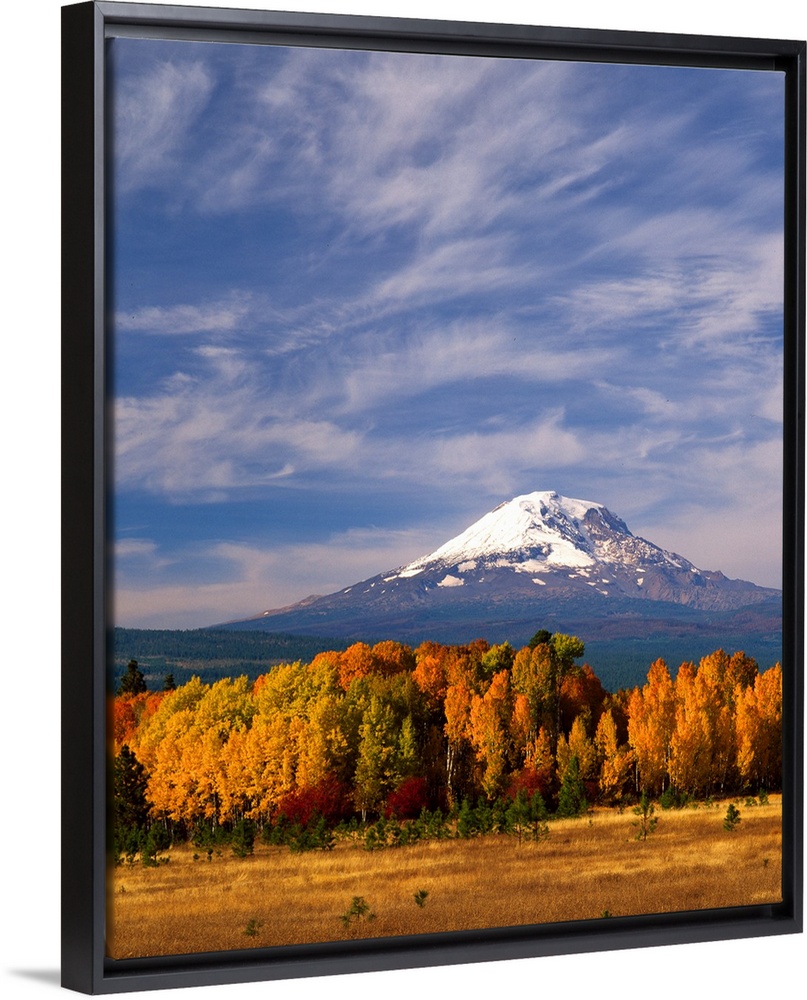<p>Mount Adams seen from a forest in fall colors with clouds overhead.</p>