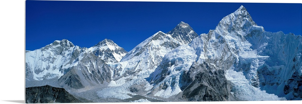 <p>Giant, wide angle landscape photograph of snow covered Himalaya Mountains against a blue sky, including Mt Chungsi, Mt Everest, and Mt Nuptsi, in the Khumbu Region of Nepal.</p>