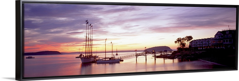 <p>Panoramic photograph sailboats at dock under a cloudy sunset with mountain silhouettes in the distance.</p>
