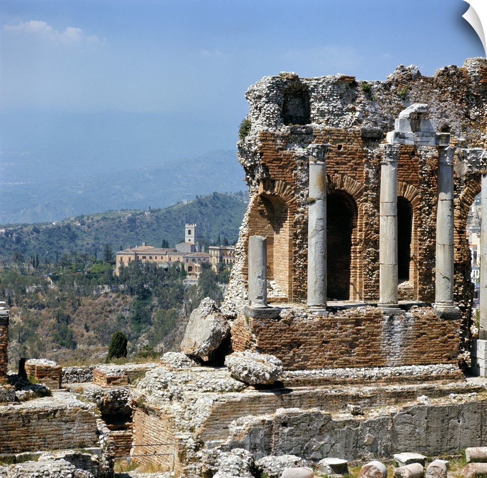 <p>Italy, Sicily, Taormina. Smoke from erupting Mt. Etna is visible from the Greek Theater in Taormina, Sicily, Italy.</p>