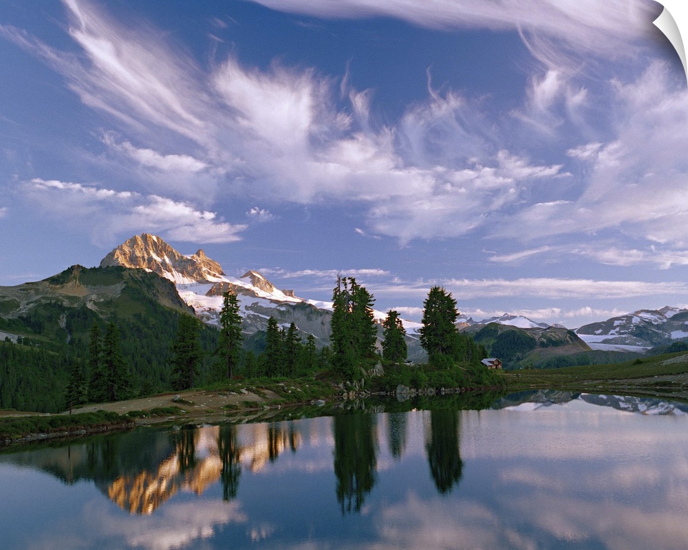 <p>Under a sky of wispy clouds, Mount Garibaldi towers over Elfin Lakes in Mount Garibaldi Provincial Park, British Columbia, Canada</p>