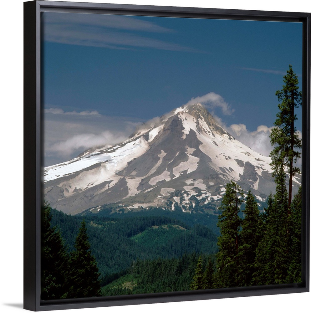 <p>Square photograph of Mount Hood with rolling hills and pine trees in the foreground.</p>