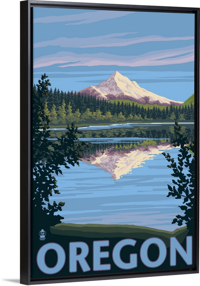 <p>Retro stylized art poster of a mountain casting a reflection in a clear blue lake.</p>