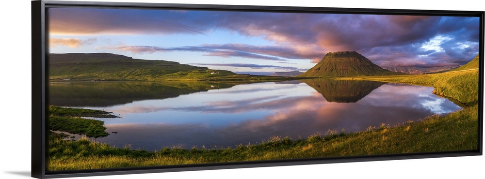 <p>Panoramic view of Mount Kirkjufell and the lake below at sunset, Iceland.</p>