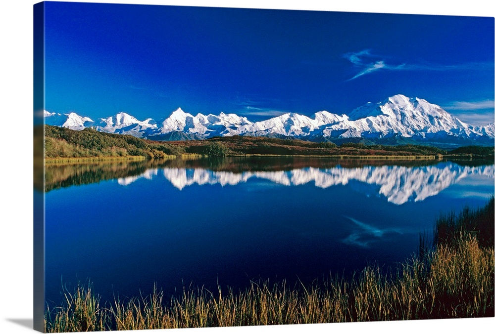 <p>Photograph of snow covered mountain range with waterfront. The sky is clear and the mountains are reflected in the water.</p>