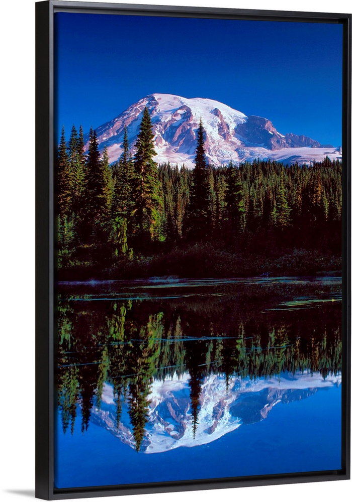 <p>Mount Rainier and a pine forest reflected in a lake.</p>