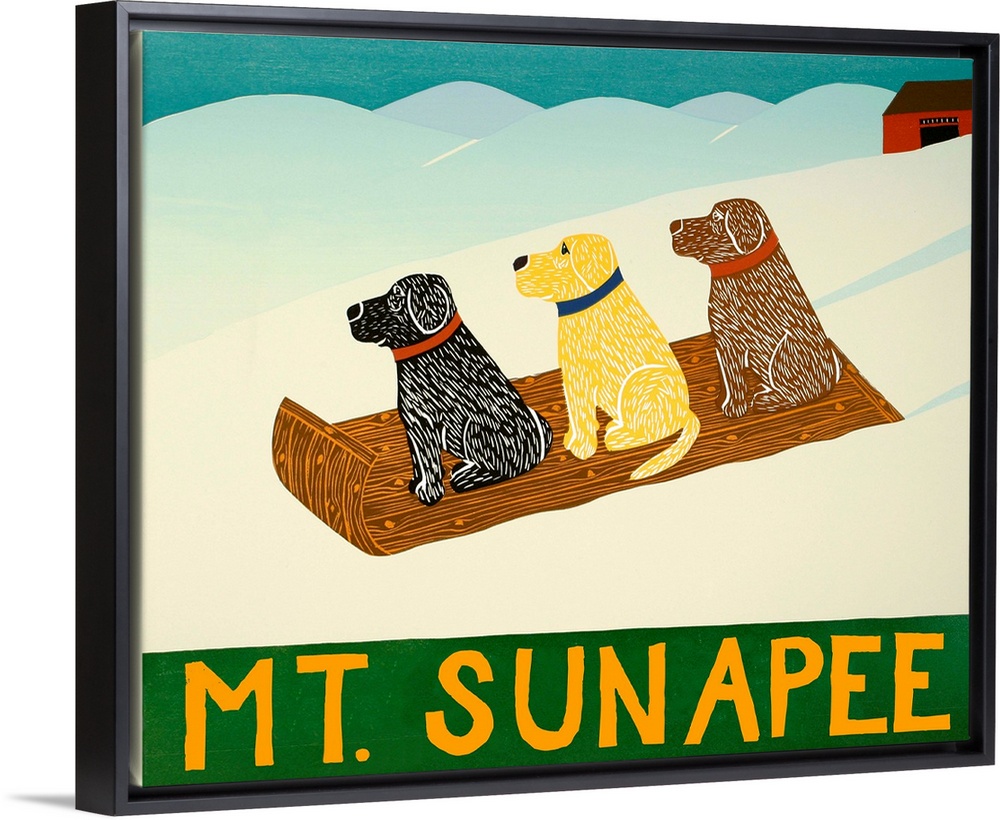 <p>Illustration of a chocolate, yellow, and black lab sledding down the slopes with "Mt. Sunapee" written on the bottom.</p>