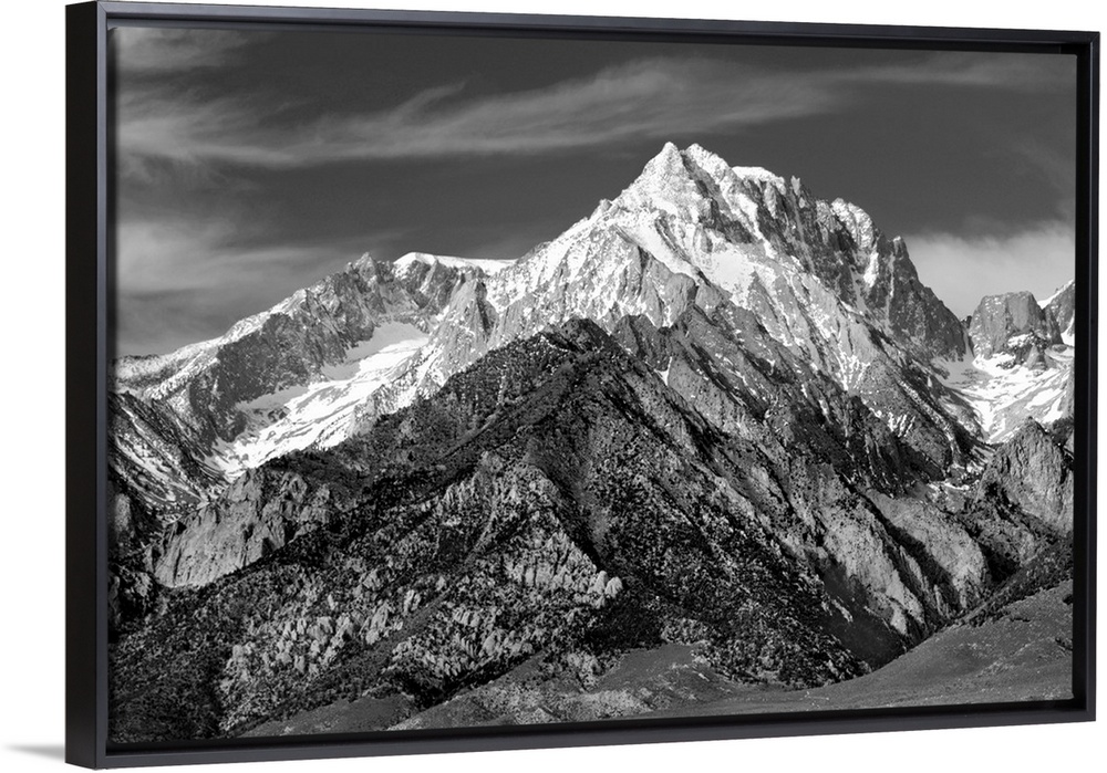 <p>Black and white photograph of Mount Williamson with snowy peaks.</p>