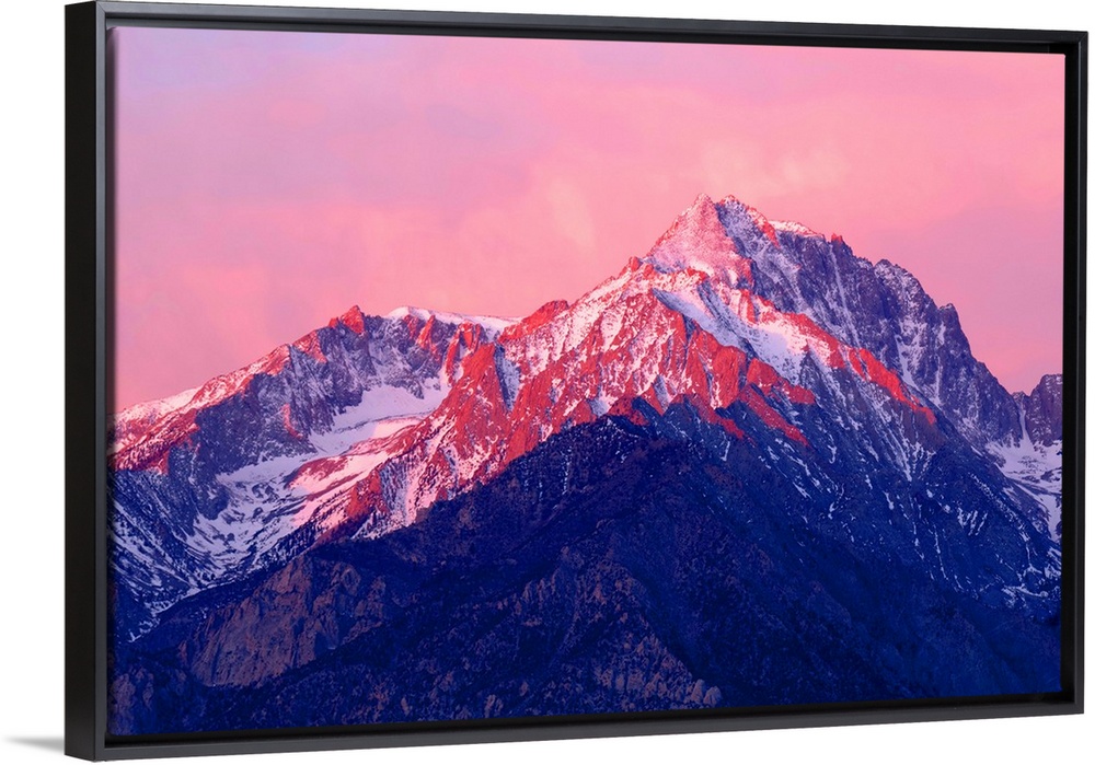 <p>Photograph of Mount Williamson at sunrise with the pink sky reflecting onto the snowy peaks.</p>