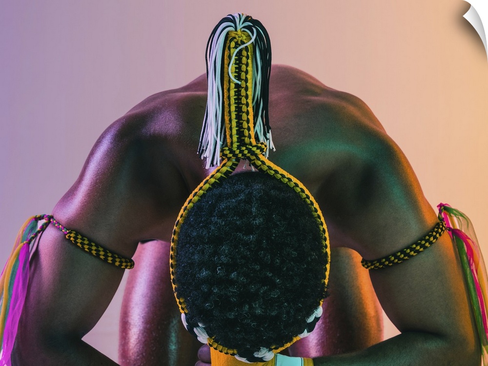 <p>Young man practicing Thai boxing on gradient background in neon light.</p>