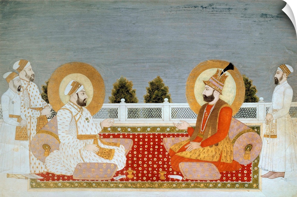 <p>Muhammad Shah (1702-1748), Indian emperor, and Nader (Nadir) Shah (1688-1747), shah of Iran. Miniature painting by an unknown artist of the Mughal school, (21 x 31 cm), Mughal dynasty (1526-1858). Musee Guimet, national museum of Asian Arts, Paris, France</p>