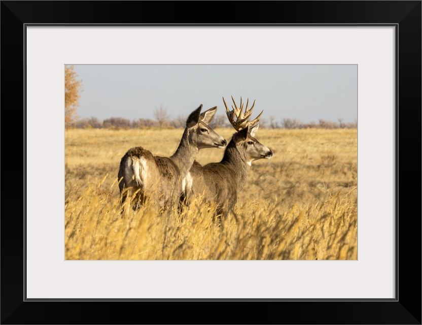 <p>Mule deer buck and doe (Odocoileus hemionus) standing in grass; Steamboat Springs, Colorado, United States of America</p>
