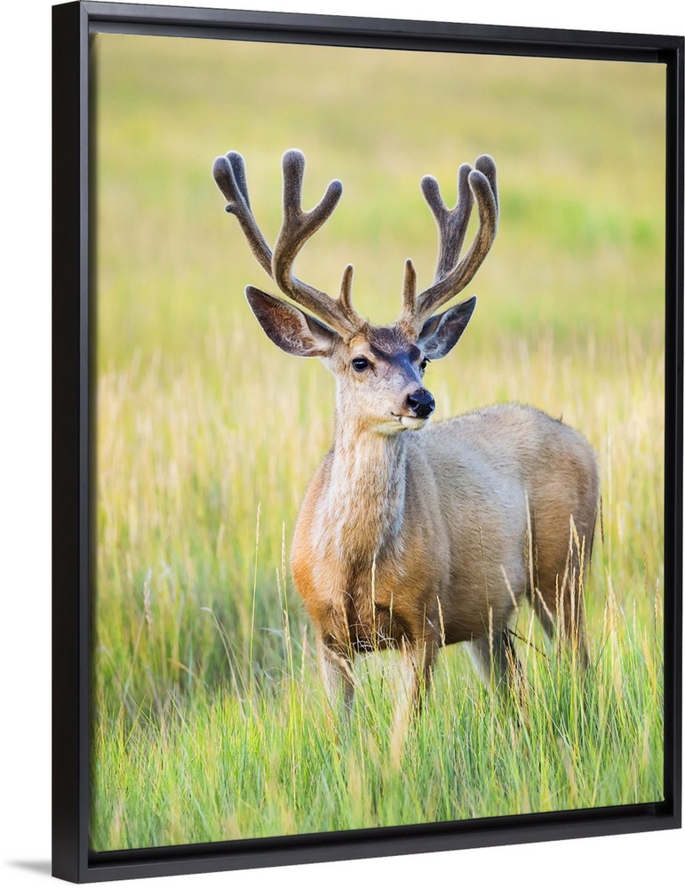 <p>Mule deer buck (Odocoileus hemionus) standing in grass; Steamboat Springs, Colorado, United States of America</p>